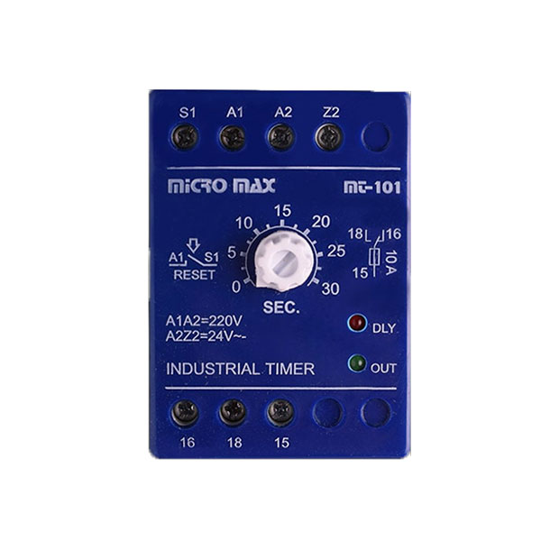 تایمر صنعتی میکرو مکس (ثانیه و دقیقه) مدل MT-101 در تابلو های فرمان اتوماسیون، زمان سنجی، راه اندازی خودکار دستگاه ها و … مورد استفاده قرار میگیرند. تایمر صنعتی میکرومکس از کیفیت و دقت بالایی برخوردار است و دارای 1 سال گارانتی می باشد. رله تایمر صنعتی میکرو مکس بسیار در صنعت پرکاربرد می باشد و طرز کار به این صورت است که با اتصال تغذیه 220 ولت AC به ترمینال های A1 و A2 و یا 24 ولت AC یا DC به ترمینال های A2 و Z2 و با روشن شدن چراغ قرمز DLY ، زمان سنجی آغاز می شود. پس از گذشت زمان تعیین شده از طرف کاربر، رله خروجی عمل کرده و با روشن شدن چراغ سبز OUT، ترمینال 15 که تا قبل از روشن شدن چراغ سبز، به ترمینال 16 وصل بوده، قطع می شود و به ترمینال 18 متصل می شود و تا زمانی که ولتاژ تغذیه برقرار باشد، در همین وضعیت باقی می ماند که با قطع ولتاژ تغذیه رله به حالت اولیه بر می گردد. جهت راه اندازی مجدد تایمر ثانیه و دقیقه میکرومکس، با اتصال ترمینال S1 به ترمینال A1 و سپس جدا کردن آن، دستگاه را RESET نمایید.