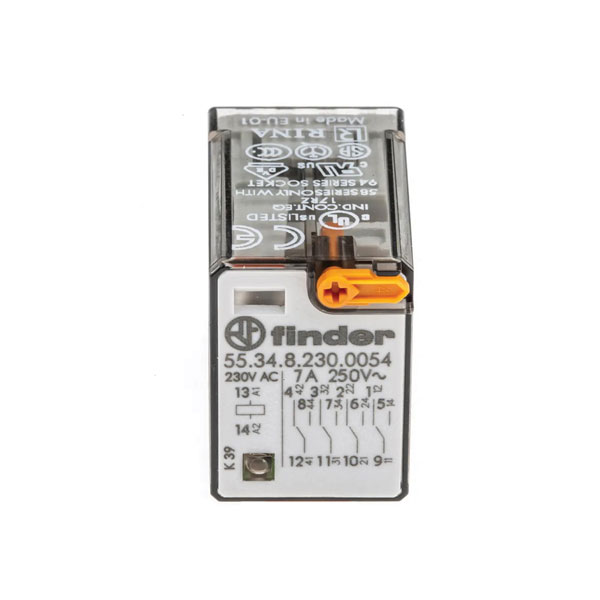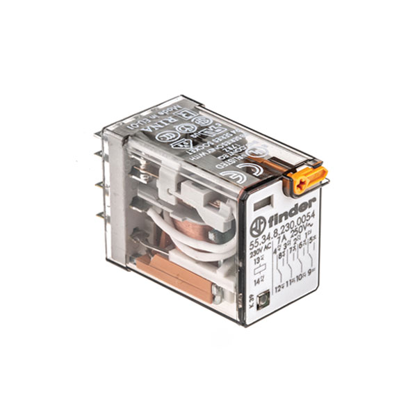 رله شیشه ای چهار کنتاکت فیندر از نوع رله قدرت 7 آمپری ساخت فیندر ایتالیا با ولتاژ بوبین ۲۳۰ ولت AC است. این رله 14 پایه و دارای 4 کنتاکت (چهار باز و چهار بسته مجزا) است که میتوان از طریق سوکت 9484 روی ریل مینیاتوری و داخل تابلو استفاده کرد. کد فنی این رله 553482300054 است. رنگ نارنجی اجزای داخلی این رله نشاندهنده ولتاژ تحریک از نوع AC است.