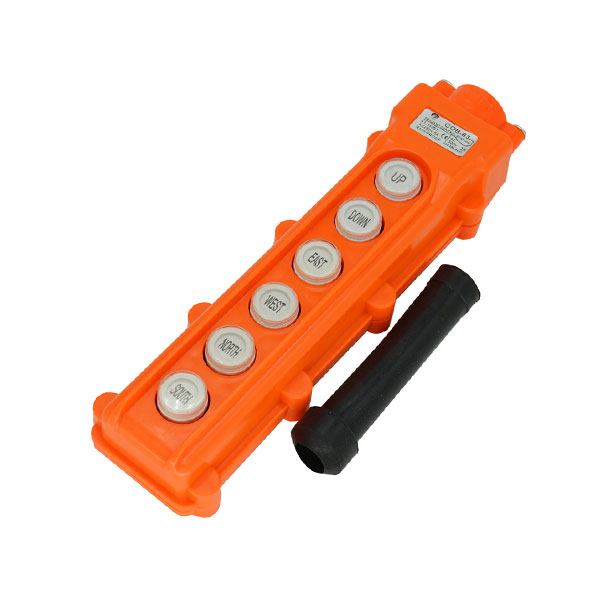 شاسی کنترل جرثقیل 6 حالته در واقع نوعی جعبه کنترل برای استفاده و کنترل جرثقیل های سقفی، بالابر های ساختمانی و دستگاه های صنعتی است. شاسی جرثقیل شش جهته، دارای شش پوش باتن از نوع حرکتی بالا (UP)، پایین (DOWN)، شرق (FAST)، غرب (West)، شمال (NORTH) و جنوب (SOUTH) است و جزء کاربردی ترین شستی های جرثقیل محسوب میشود که ساده ترین نوع مکانیزم را دارد. این کنترلر ها در دو نوع با سیم و بی سیم تولید می شوند. این تجهیزات می توانند فرمان های لازم را به صورت از راه دور ( بدون نیاز به شاسی های روی پنل تابلوی کنترل) برای تابلوی برق کنترل اصلی و کنتاکتور ها ارسال کنند تا دستگاه را در جهت مورد نیاز به حرکت وا دارند. کنترل های بالابر های ساختمانی یا جرثقیل ها با توجه به نیاز در مدل های مختلف تولید می شود و تعداد شاسی های موجود بر روی هر کدام می تواند متفاوت باشد. این محصولات با درجه حفاظتی بالا تولید می شوند و در مقابل ضربه و آسیب مقاوم هستند چرا که عموما در محیط های صنعتی و ساختمانی مورد استفاده قرار می گیرند.