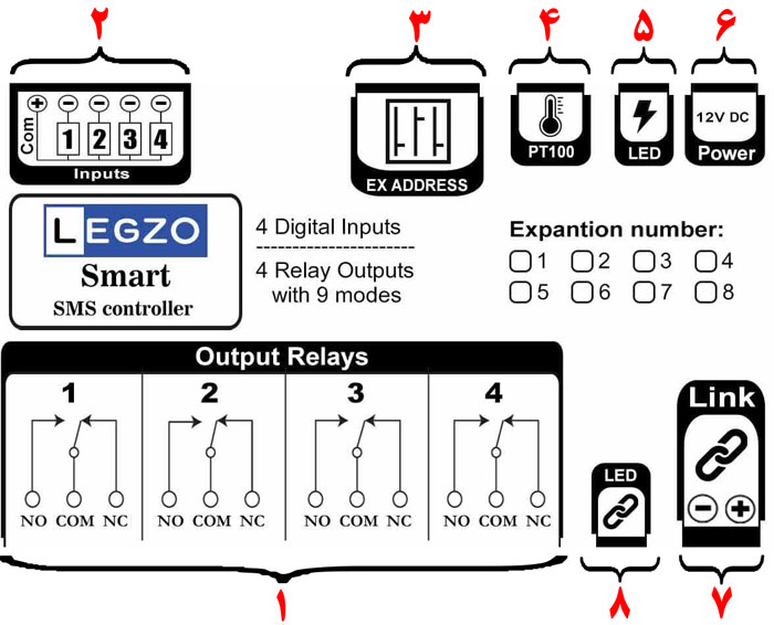 7. ترمینال Link: برای اتصال ماژول به دستگاه کنترل پیامکی و یا اتصال به سایر بردهای رله گسترش از ترمینال لینک استفاده بفرمایید.