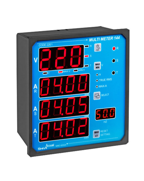 مولتی متر 144 شیوا امواج مدل MME-6000A دارای نمایشگر دیجیتالی بزرگ برای اندازه گیری و نمایش 6 پارامتر ولتاژ، 6 پارامتر ماکزیمم ولتاژ و 6 پارامتر مینیمم ولتاژ، اندازه گیری و نمایش همزمان 3 پارامتر جریان،3 پارامتر ماکزیمم جریان و همچنین نمایش فرکانس است. مولتی متر 144 شیوا امواج، جریان های مورد نظر را به دو روش TRUE RMS و روش معمولی اندازه گیری می کند. همچنین با کمک این دستگاه می توانید همزمان ولتاژ و جریان و سیگنال های برق ورودی ( R,S,T ) را اندازه گیری نمایید.