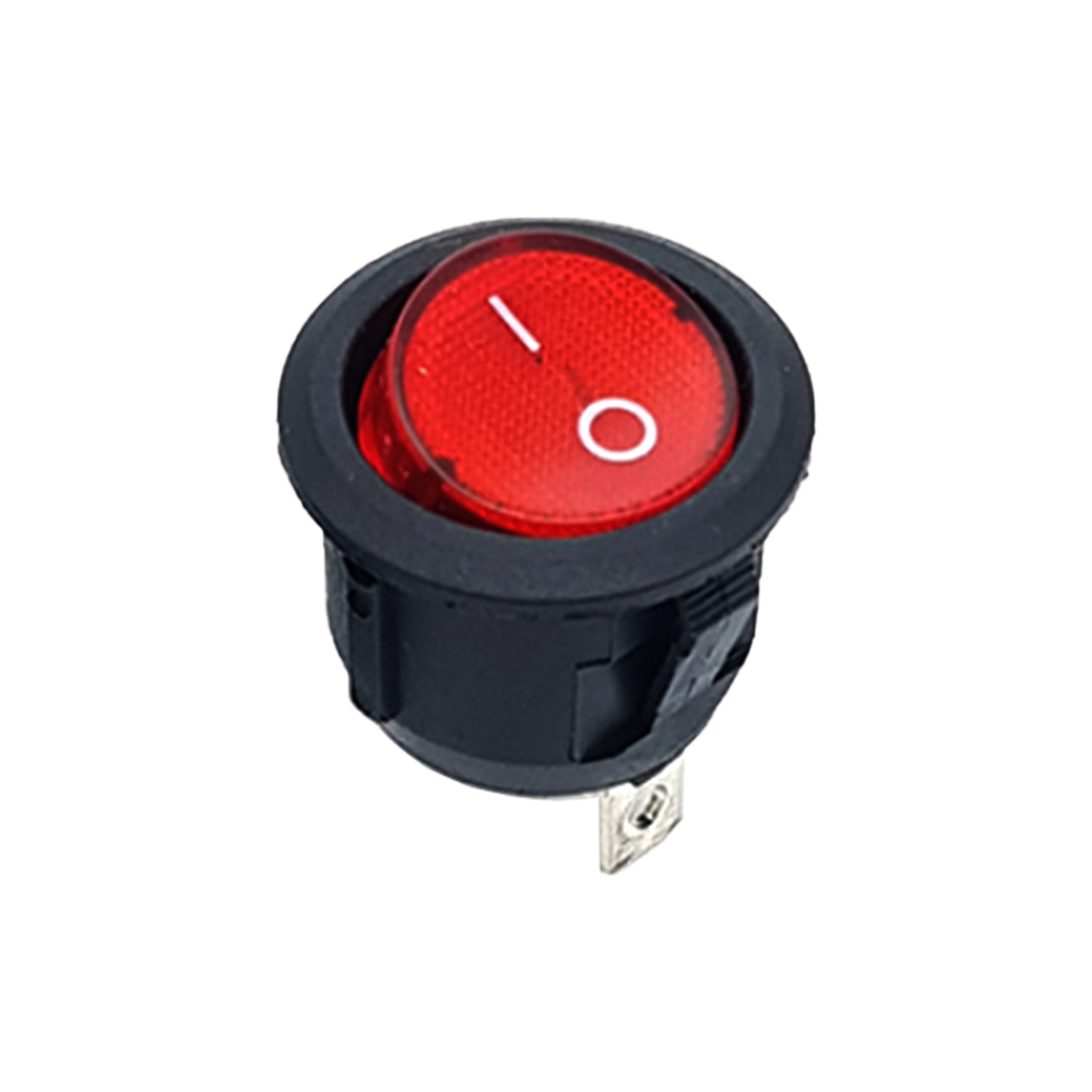 کلید راکر دایره ای شکل چراغدار، از نوع کلیدهای دو حالته بوده که آن را کلید صفر و یک نیز می نامند. جهت مصارف صنعتی و لوازم الکترونیکی و برقی، تعمیر قسمت کلید خاموش و روشن دو حالته انواع دستگاه ها یا ساخت پروژههایی که در آن ها نیاز به کلید راکر دو حالته گرد است. جنس بدنه و سطح کلید پلاستیکی عایق، جنس پایه ها فلزی دارای حفره، رنگ بدنه و سطح کلید مشکی می باشد.
