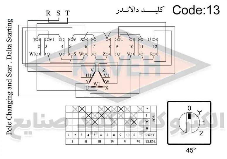کلید گردان دالاندر الکترو ، وسیله ای است که با تغییر دادن تعداد قطب، سرعت موتور را تغییر می دهد. برای تغییر سرعت چندین راه وجود دارد که از جمله این روش ها می توان به تغییر تعداد قطب با استفاده از سیم پیچ های جدا از هم، تغییر قطب با یک سیم پیچ، تغییر دادن میزان ولتاژ، ایجاد تغییر در مقاومت روتور دستگاه و … اشاره کرد. نسبت سرعت (دور) در کلید گردان دالاندر 1 به 2 می باشد. که با توجه به میزان سرعت دستگاه، سرعت آن را می شود نصف و یا دو برابر کرد. با توجه به دیاگرام ،کلید گردان دالاندر دارای 9 ترمینال می باشد؛ سه ترمینال ورودی و 6 ترمینال خروجی. ترمینال های ورودی با نام های R ، S ، T بر روی بدنه نام گذاری شده اند که در استاندار های جدید به L1 ، L2 ، L3 شناخته می شوند. ترمینال های خروجی نیز با نام های U ، V ، W و X ، Y، Z بر روی کلید مشخص شده اند که در استاندارد جدید به U V W و U1 V1 W1 شناخته می شوند. برای راه اندازی کردن موتور، سه فاز برق را به ترمینال های ورودی کلید متصل می کنیم و 6 ترمینال خروجی را نیز به ترتیب به نام های مشابه خودشان به سر موتور متصل می کنیم. در این مدل کلیدها چون پیوستگی دورها اهمیت دارد، ترتیب قرار گیری راهنمای کلید اهرم بر روی لیبل و صفحه کلید (حالت های کلید) از صفر شروع می شود. و دارای حالت صفر، ستاره (دلتا)، یک و دو می باشد. (0-ستاره-1-2). این نکته را در نظر داشته باشید که برای راه اندازی موتور های دالاندر حتما وضعیت کلید را در ابتدا بر روی حالت ستاره قرار دهید تا موتور روشن شود. با قرار دادن کلید در حالت یک، موتور با سرعت پایین شروع به کار می کند. اگر می خواهید از نهایت سرعت موتور بهره ببرید کلید را در حالت 2 قرار دهید.