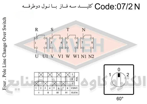 کلید گردان سه فاز و نول دوطرفه 200 آمپر الکترو کاوه KA20007/2N