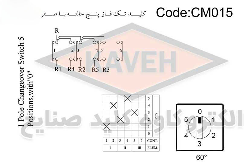 کلید گردان یک پل پنج حالته با صفر الکترو کاوه 25CM015