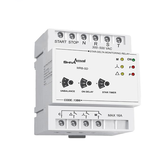 کنترل فاز ستاره مثلث شیوا امواج یکی از انواع تجهیزات حفاظتی مناسب راه اندازی موتورهای رتور قفسی با تبدیل ستاره به مثلث می باشد و از تجهیزات الکتریکی در برابر اختلالاتی مانند افزایش و کاهش ولتاژ، عدم توالی و تقارن فازها و یا قطع شدن هریک از فازها محافظت می کند. این کنترل فاز دارای سه پیچ تنظیم می باشد که Unbalance برای تنظیم عدم تقارن (%25-2)، On Delay برای تاخیر در وصل (30-2 ثانیه) و start timer برای زمان وصل رله ستاره (30-2 ثانیه) است. همچنین این کنترل کننده دارای 6 نمایشگر است که با نمادها و رنگ ها مختلف طراحی شده اند. این کنترل فاز زمانی برابر با 50 میلی ثانیه را صرف قطع رله ستاره و وصل رله مثلث می کند و تاخیر زمان قطع 3 ثانیه می باشد.